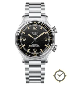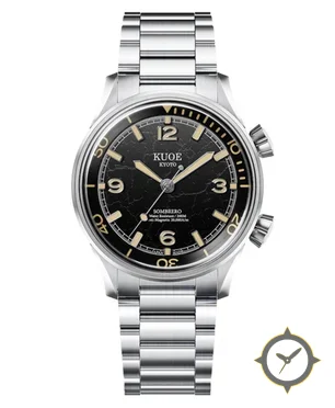 Eine Taucheruhr-Uhr mit einem vielseitigen 38mm Gehäuse, das an fast jedes Handgelenk passt, gefertigt aus Edelstahl mit einem Zifferblatt in schwarz und einer besonderen "distressed/marbled with light cracking effect (aged finish)"-Oberfläche.