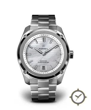 Eine Luxus-Uhr mit einem vielseitigen 40mm Gehäuse, das an fast jedes Handgelenk passt, gefertigt aus Edelstahl mit einem Zifferblatt in weiß und einer besonderen "mother-of-pearl"-Oberfläche.