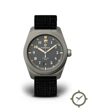 Eine Field-Uhr mit einem vielseitigen 38.5mm Gehäuse, das an fast jedes Handgelenk passt, gefertigt aus Titan mit einem Zifferblatt in grau und einer besonderen "matte"-Oberfläche.