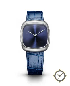 Eine Dress-Uhr mit einem 37.5mm Gehäuse im Vintage-Stil gefertigt aus Edelstahl mit einem Zifferblatt in blau und einer besonderen "sunburst"-Oberfläche.