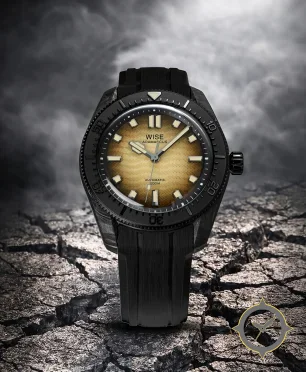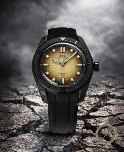 Eine Taucheruhr-Uhr mit einem markanten 47.5mm Auftritt am Handgelenk, gefertigt aus Carbon mit einem Zifferblatt in gold und einer besonderen "Damascus-style textured finish (patterned grain)"-Oberfläche.