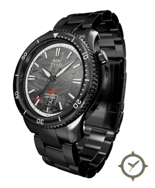 Eine Taucheruhr-Uhr mit einem markanten 50mm Auftritt am Handgelenk, gefertigt aus Edelstahl mit einem Zifferblatt in grau und einer besonderen "meteorite texture / cross-hatch finishing"-Oberfläche.