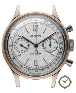 Eine Chronograph-Uhr mit einem vielseitigen 38.5mm Gehäuse, das an fast jedes Handgelenk passt, gefertigt aus Gold mit einem Zifferblatt in weiß und einer besonderen "grained / frosted (snowflake-like textured finish)"-Oberfläche.