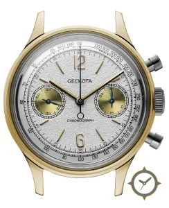 Eine Chronograph-Uhr mit einem vielseitigen 41mm Gehäuse, das an fast jedes Handgelenk passt, gefertigt aus Gold mit einem Zifferblatt in weiß und einer besonderen "granulated / frosted texture"-Oberfläche.