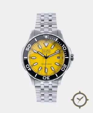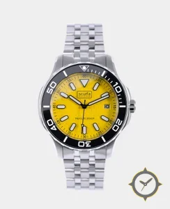 Eine Taucheruhr-Uhr mit einem vielseitigen 39.5mm Gehäuse, das an fast jedes Handgelenk passt, gefertigt aus Edelstahl mit einem Zifferblatt in gelb und einer besonderen "honeycomb"-Oberfläche.