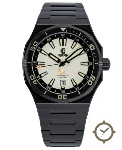Eine Taucheruhr-Uhr mit einem markanten 46.5mm Auftritt am Handgelenk, gefertigt aus Edelstahl mit einem Zifferblatt in weiß und einer besonderen "glossy with luminous coating"-Oberfläche.