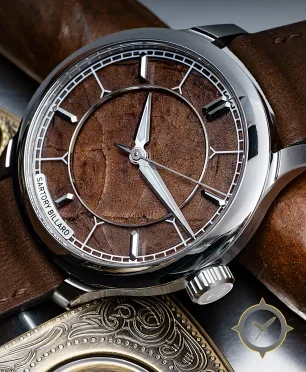 Eine Dress-Uhr mit einem markanten 43mm Auftritt am Handgelenk, gefertigt aus Edelstahl mit einem Zifferblatt in braun und einer besonderen "aged leather-like textured surface"-Oberfläche.