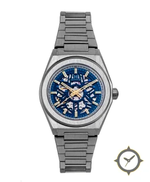Eine Skelett-Uhr mit einem markanten 45.5mm Auftritt am Handgelenk, gefertigt aus Edelstahl mit einem Zifferblatt in blau und einer besonderen "skeleton / open-worked"-Oberfläche.