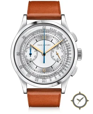 Eine Chronograph-Uhr mit einem 33.5mm Gehäuse im Vintage-Stil gefertigt aus Edelstahl mit einem Zifferblatt in silber und einer besonderen "brushed sunray with concentric ring finishing"-Oberfläche.