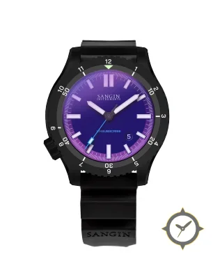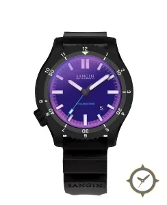 Eine Taucheruhr-Uhr mit einem 32.5mm Gehäuse im Vintage-Stil gefertigt aus Edelstahl mit einem Zifferblatt in lila und einer besonderen "sunburst gradient"-Oberfläche.