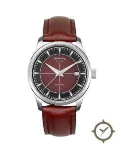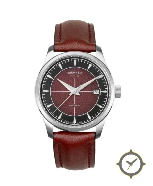 Eine Vintage-Uhr mit einem 35mm Gehäuse im Vintage-Stil gefertigt aus Edelstahl mit einem Zifferblatt in karmesinrot und einer besonderen "textured/grain (sunburst-like)"-Oberfläche.