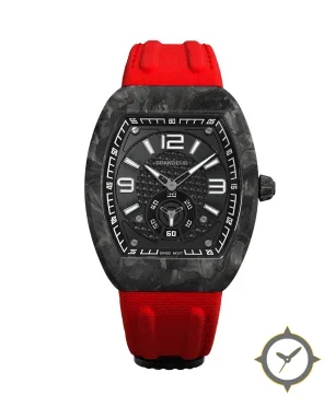 Eine Sport-Uhr gefertigt aus Carbon mit einem Zifferblatt in schwarz und einer besonderen "carbon-fiber weave"-Oberfläche.
