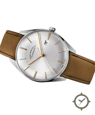 Eine Dress-Uhr mit einem markanten 42mm Auftritt am Handgelenk, gefertigt aus Edelstahl mit einem Zifferblatt in silber und einer besonderen "sunburst / brushed"-Oberfläche.