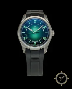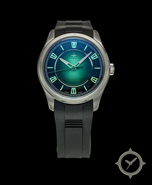 Eine Sport-Uhr mit einem markanten 42mm Auftritt am Handgelenk, gefertigt aus Edelstahl mit einem Zifferblatt in grün und einer besonderen "fumé/sunburst gradient"-Oberfläche.