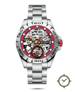 Eine Skelett-Uhr mit einem markanten 42.5mm Auftritt am Handgelenk, gefertigt aus Edelstahl mit einem Zifferblatt in silber und einer besonderen "skeletonized / open-work showing movement"-Oberfläche.