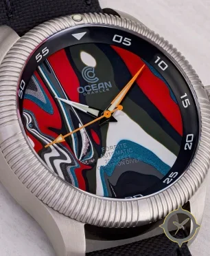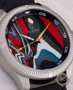 Eine Taucheruhr-Uhr mit einem markanten 44.5mm Auftritt am Handgelenk, gefertigt aus Edelstahl mit einem Zifferblatt in rot und einer besonderen "marbled/swirl lacquer"-Oberfläche.
