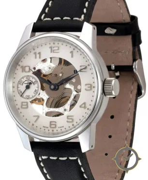 Eine Skelett-Uhr gefertigt aus Edelstahl mit einem Zifferblatt in weiß und einer besonderen "open-worked / skeletonized, partially transparent to show movement"-Oberfläche.