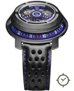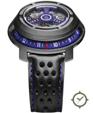 Eine Skelett-Uhr mit einem markanten 44.5mm Auftritt am Handgelenk, gefertigt aus Edelstahl mit einem Zifferblatt in lila und einer besonderen "skeleton/exposed movement with visible gears"-Oberfläche.