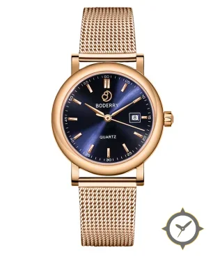 Eine Dress-Uhr gefertigt aus Gold mit einem Zifferblatt in marineblau und einer besonderen "sunburst"-Oberfläche.