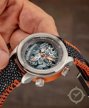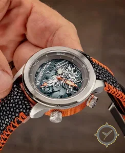 Eine Taucheruhr-Uhr mit einem vielseitigen 38mm Gehäuse, das an fast jedes Handgelenk passt, gefertigt aus Edelstahl mit einem Zifferblatt in grün und einer besonderen "sculpted bas-relief (engraved/3D)"-Oberfläche.