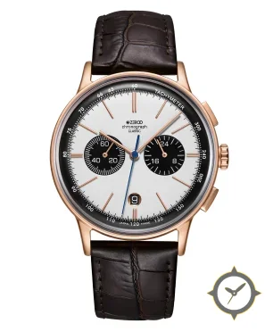Eine Chronograph-Uhr mit einem 34.5mm Gehäuse im Vintage-Stil gefertigt aus Edelstahl mit einem Zifferblatt in weiß und einer besonderen "matte"-Oberfläche.