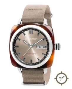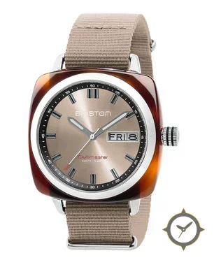 Eine Fahrer-Uhr mit einem markanten 43.5mm Auftritt am Handgelenk, gefertigt aus Edelstahl mit einem Zifferblatt in braun und einer besonderen "sunburst"-Oberfläche.
