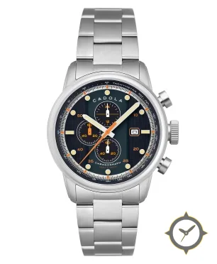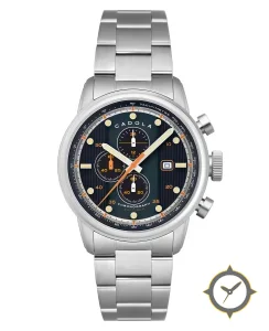 Eine Chronograph-Uhr mit einem 35.5mm Gehäuse im Vintage-Stil gefertigt aus Edelstahl mit einem Zifferblatt in marineblau und einer besonderen "vertical striped (ribbed) finish"-Oberfläche.