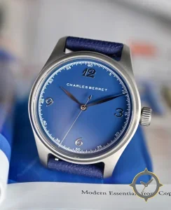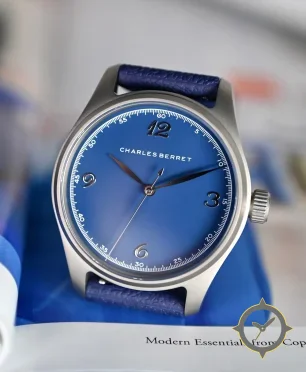 Eine Minimalistisch-Uhr gefertigt aus Edelstahl mit einem Zifferblatt in blau und einer besonderen "sunburst/gradient finish"-Oberfläche.