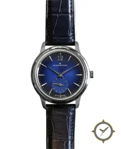 Eine Dress-Uhr mit einem 37.5mm Gehäuse im Vintage-Stil gefertigt aus Edelstahl mit einem Zifferblatt in blau und einer besonderen "sunburst / radial gradient"-Oberfläche.