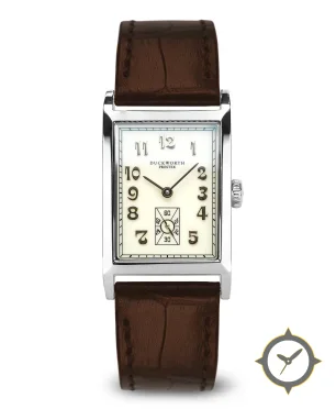 Eine Dress-Uhr mit einem 28.5mm Gehäuse im Vintage-Stil gefertigt aus Edelstahl mit einem Zifferblatt in weiß und einer besonderen "smooth lacquer"-Oberfläche.