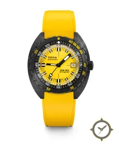 Eine Taucheruhr-Uhr mit einem markanten 49mm Auftritt am Handgelenk, gefertigt aus Carbon mit einem Zifferblatt in gelb und einer besonderen "matte"-Oberfläche.