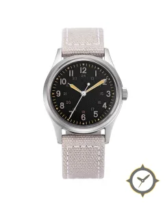 Eine Field-Uhr mit einem 37.5mm Gehäuse im Vintage-Stil gefertigt aus Edelstahl mit einem Zifferblatt in schwarz und einer besonderen "grained matte"-Oberfläche.