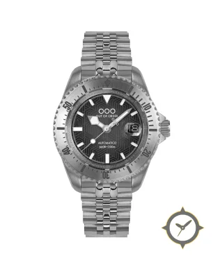 Eine Taucheruhr-Uhr mit einem vielseitigen 38mm Gehäuse, das an fast jedes Handgelenk passt, gefertigt aus Edelstahl mit einem Zifferblatt in schwarz und einer besonderen "textured geometric/maze engraving"-Oberfläche.