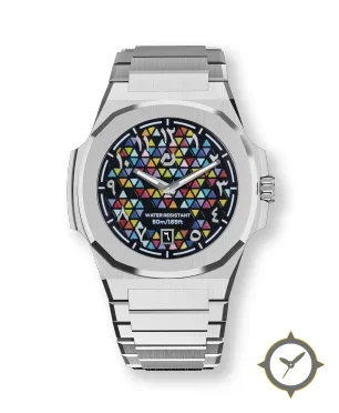 Eine Sport-Uhr mit einem vielseitigen 40.5mm Gehäuse, das an fast jedes Handgelenk passt, gefertigt aus Edelstahl mit einem Zifferblatt in schwarz und einer besonderen "multicolored triangular mosaic/enamel-like finish"-Oberfläche.