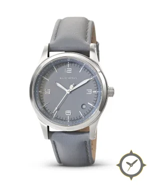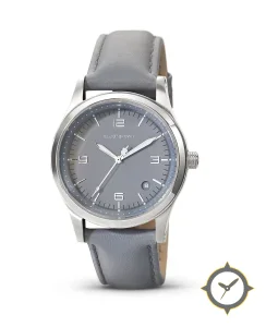 Eine Minimalistisch-Uhr gefertigt aus Edelstahl mit einem Zifferblatt in grau und einer besonderen "matte"-Oberfläche.