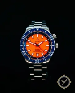 Eine Taucheruhr-Uhr mit einem vielseitigen 39.5mm Gehäuse, das an fast jedes Handgelenk passt, gefertigt aus Edelstahl mit einem Zifferblatt in orange und einer besonderen "wavy texture (wave pattern)"-Oberfläche.