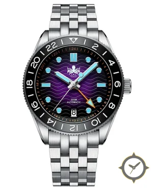 Eine GMT-Uhr mit einem markanten 42mm Auftritt am Handgelenk, gefertigt aus Edelstahl mit einem Zifferblatt in lila und einer besonderen "wavy"-Oberfläche und einer echten GMT-Funktion, mit der du eine zweite Zeitzone verfolgen kannst.
