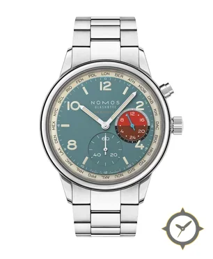 Eine Weltzeituhr-Uhr mit einem markanten 42.5mm Auftritt am Handgelenk, gefertigt aus Edelstahl mit einem Zifferblatt in türkis und einer besonderen "matte"-Oberfläche, ideal für Weltenbummler dank der Weltzeit-Funktion.