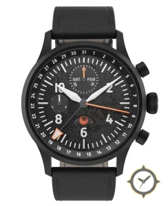 Eine Pilot-Uhr mit einem markanten 43.5mm Auftritt am Handgelenk, gefertigt aus Beschichtung mit einem Zifferblatt in schwarz und einer besonderen "textured, speckled/grainy finish"-Oberfläche und einer wunderschönen Mondphasenanzeige.