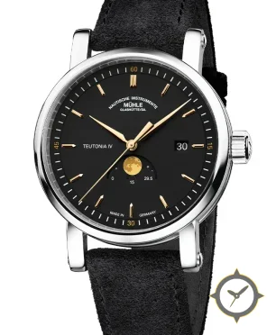 Eine Dress-Uhr mit einem 37.5mm Gehäuse im Vintage-Stil gefertigt aus Edelstahl mit einem Zifferblatt in schwarz und einer besonderen "matte"-Oberfläche und einer wunderschönen Mondphasenanzeige.