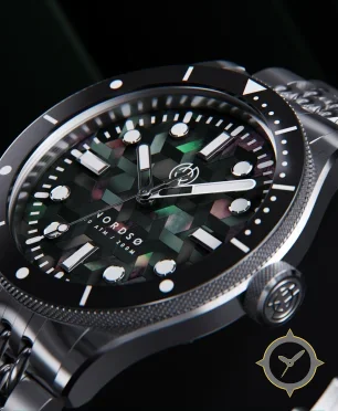 Eine Taucheruhr-Uhr mit einem vielseitigen 39.5mm Gehäuse, das an fast jedes Handgelenk passt, gefertigt aus Edelstahl mit einem Zifferblatt in schwarz und einer besonderen "mother-of-pearl iridescent mosaic"-Oberfläche.