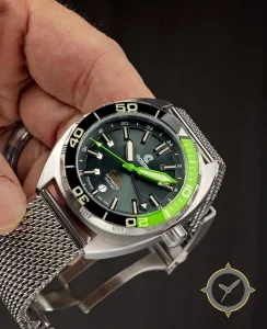 Eine Taucheruhr-Uhr mit einem 36mm Gehäuse im Vintage-Stil gefertigt aus Edelstahl mit einem Zifferblatt in grün und einer besonderen "sunburst/gradient"-Oberfläche und einer echten GMT-Funktion, mit der du eine zweite Zeitzone verfolgen kannst.