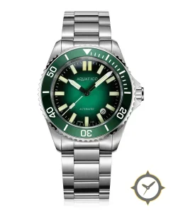 Eine Taucheruhr-Uhr gefertigt aus Edelstahl mit einem Zifferblatt in grün und einer besonderen "sunburst gradient"-Oberfläche.