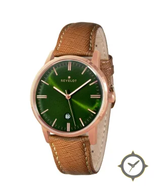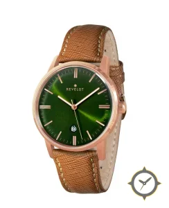 Eine Dress-Uhr mit einem vielseitigen 39mm Gehäuse, das an fast jedes Handgelenk passt, gefertigt aus Gold mit einem Zifferblatt in grün und einer besonderen "sunburst"-Oberfläche.