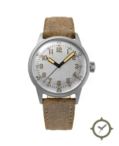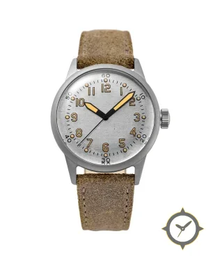 Eine Field-Uhr gefertigt aus Edelstahl mit einem Zifferblatt in silber und einer besonderen "brushed"-Oberfläche.