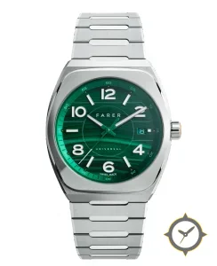 Eine Sport-Uhr mit einem markanten 44mm Auftritt am Handgelenk, gefertigt aus Edelstahl mit einem Zifferblatt in grün und einer besonderen "malachite banded/striped texture"-Oberfläche.