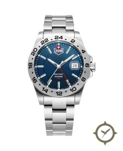 Eine -Uhr mit einem markanten 42.5mm Auftritt am Handgelenk, gefertigt aus Edelstahl mit einem Zifferblatt in blau und einer besonderen "sunburst"-Oberfläche.