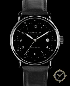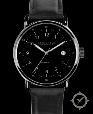 Eine Dress-Uhr mit einem markanten 45mm Auftritt am Handgelenk, gefertigt aus Edelstahl mit einem Zifferblatt in schwarz und einer besonderen "smooth lacquer"-Oberfläche.