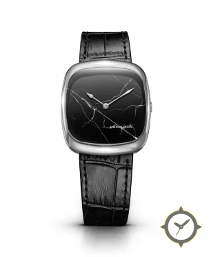 Eine Dress-Uhr mit einem markanten 42.5mm Auftritt am Handgelenk, gefertigt aus Edelstahl mit einem Zifferblatt in schwarz und einer besonderen "polished stone / marble finish"-Oberfläche.
