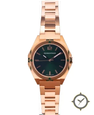 Eine Luxus-Uhr mit einem vielseitigen 39.5mm Gehäuse, das an fast jedes Handgelenk passt, gefertigt aus Gold mit einem Zifferblatt in grün und einer besonderen "sunburst"-Oberfläche.